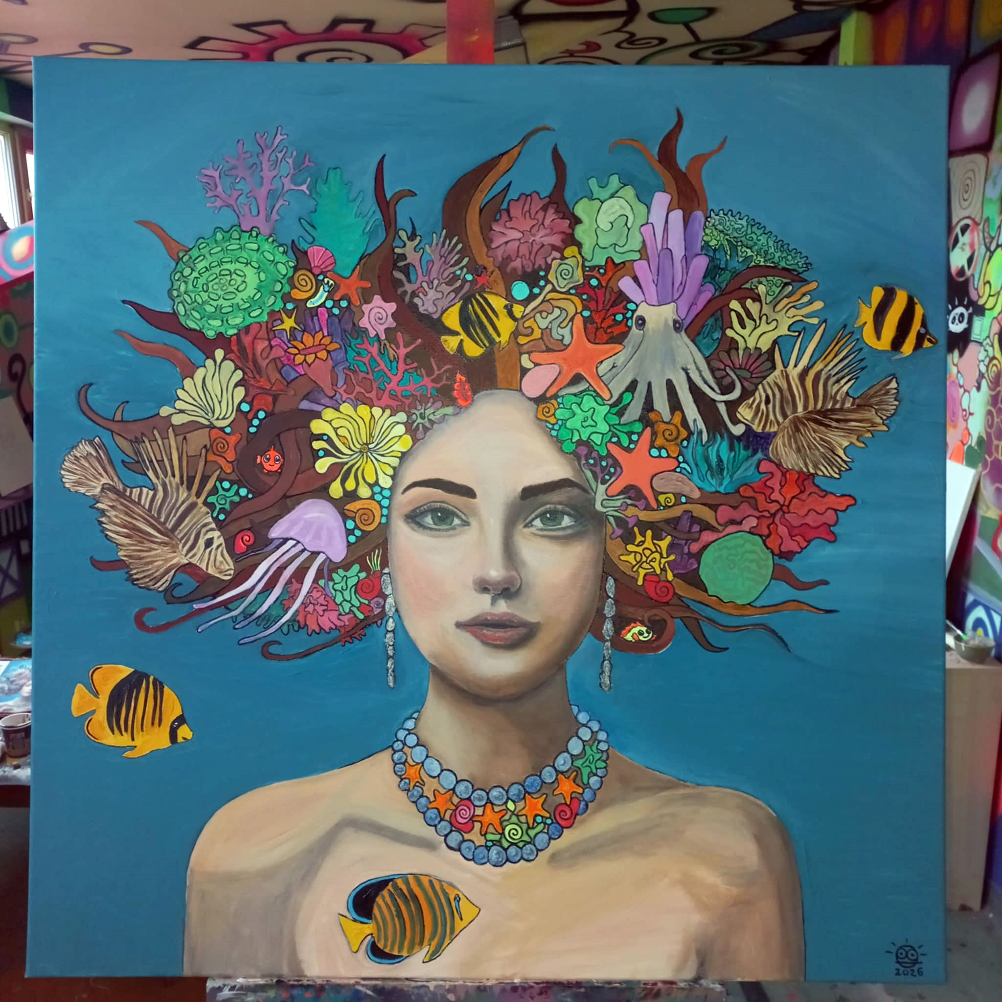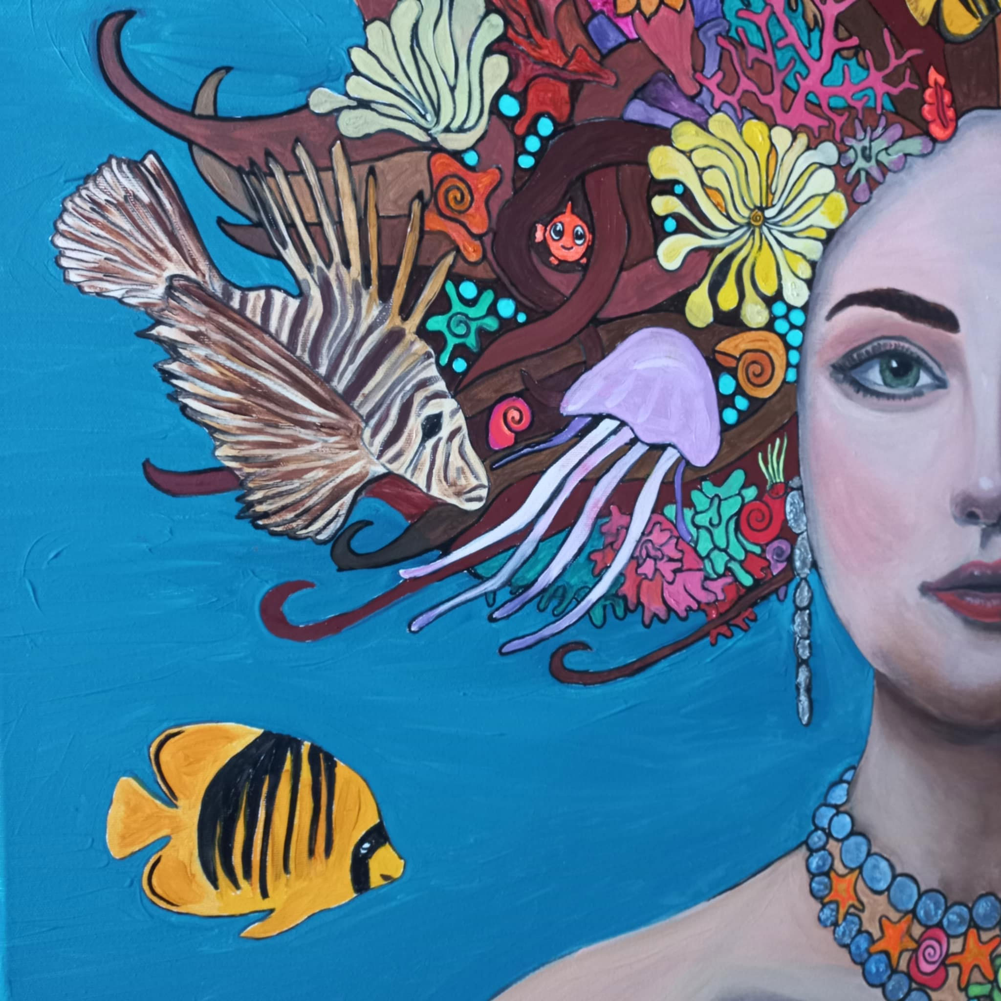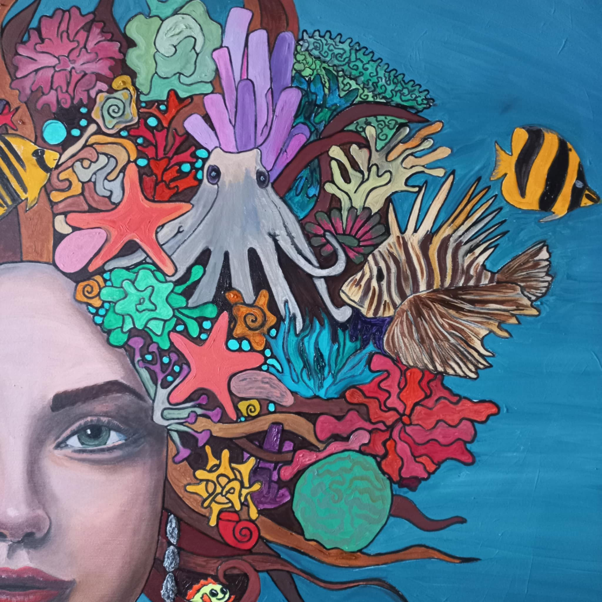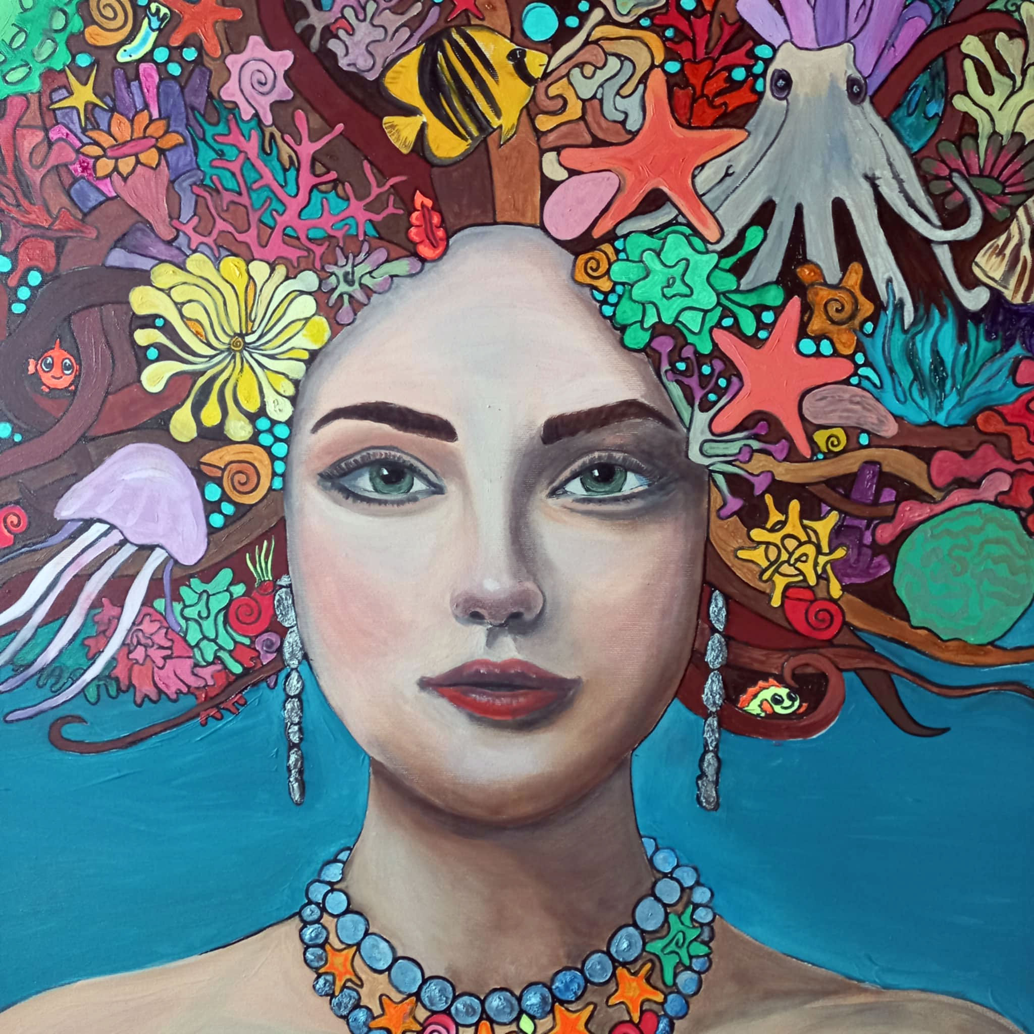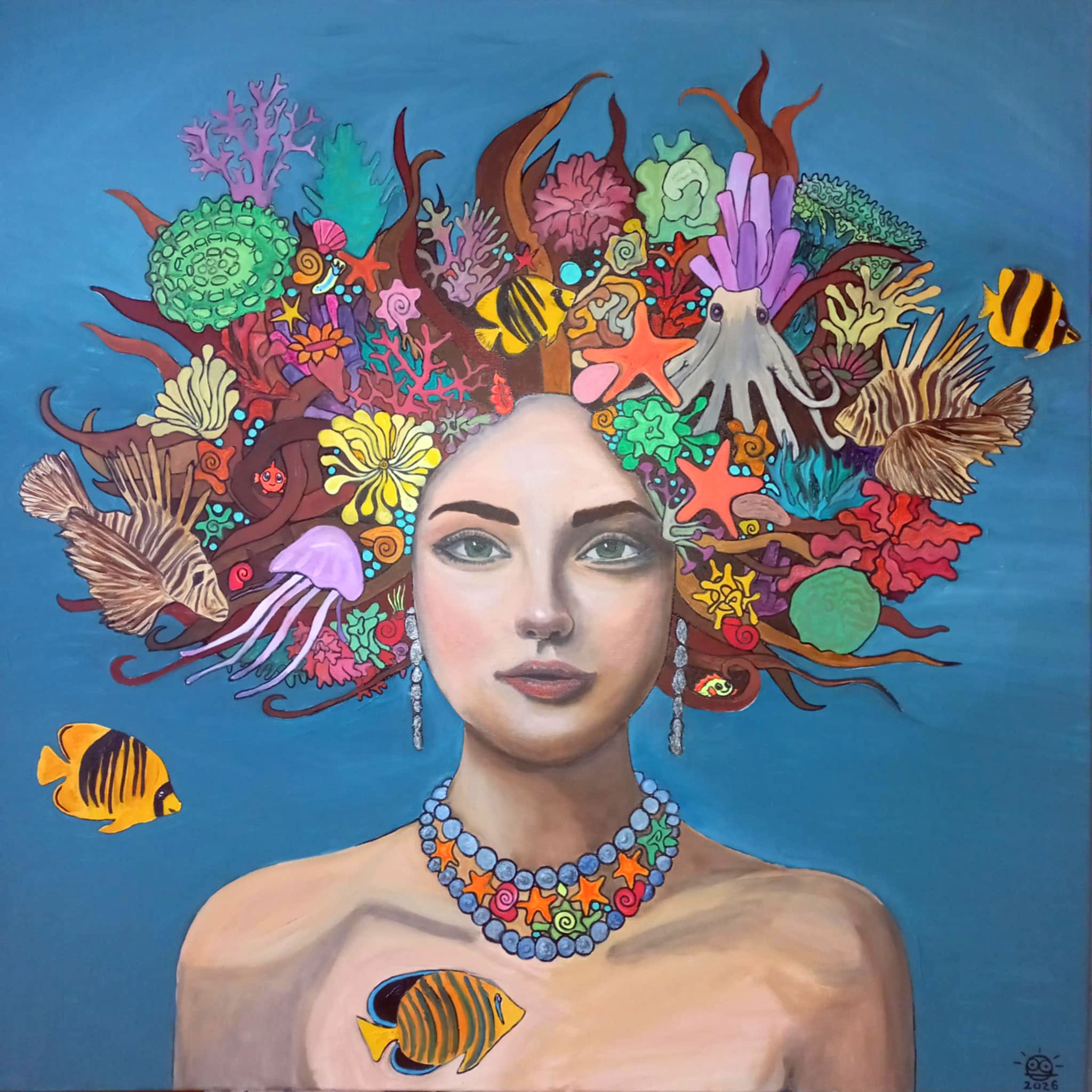 Oil on canvas (100 x 100 cm / 39 x 39 in) presents a captivating portrait of a woman in the style of Fantastic Realism. Her face radiates a profound serenity that contrasts with the wild coral crown in her hair. Within the coral’s embrace, life pulses—from dominant lionfish and an octopus to vibrant angelfish and tiny nudibranchs. Every detail, including the sea stars and shells woven into her “mane,” confirms her role as a living sanctuary. The background, in a calming shade of Deep Blue, draws the viewer into a meditative silence, bringing the beauty of marine biodiversity closer to them.